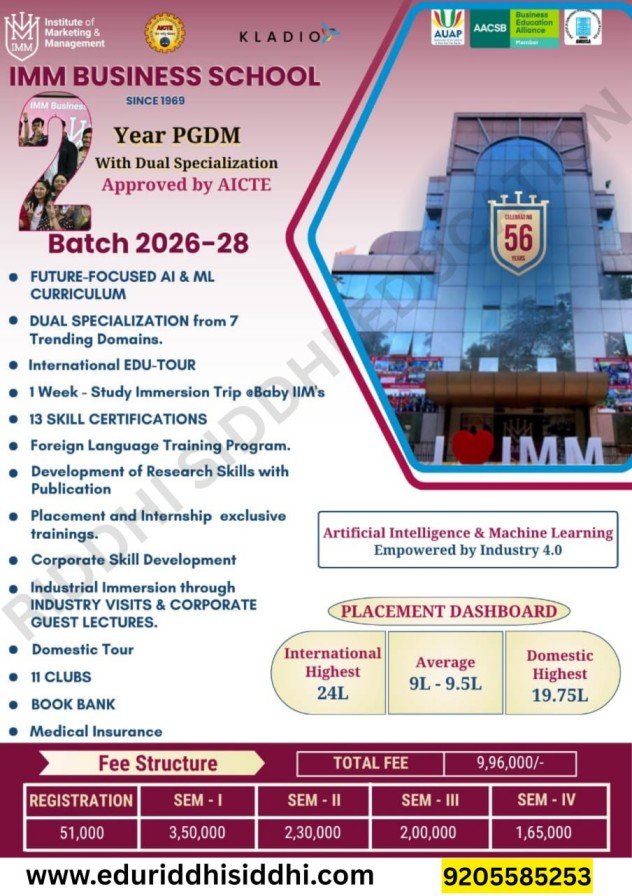Institute of Marketing & Management (IMM) is a private business school in New Delhi, established in 1969 and focused on management education (PGDM, BBA, etc.). It is often called IMM Delhi or IMM Business School
